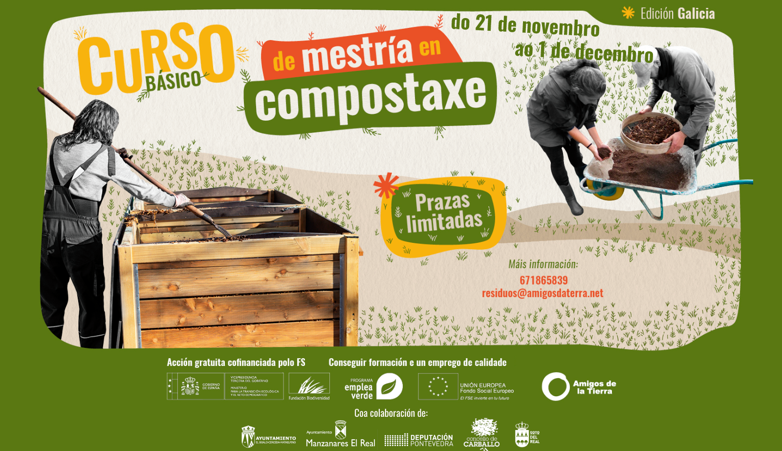 Este proxecto foi aprobado pola Fundación Biodiversidade do Ministerio para a Transición Ecolóxica e o Reto Demográfico no marco do Programa Empleaverde, iniciativa para o impulso e a mellora do emprego, o emprendemento e o medio ambiente. Trátase de accións gratuítas cofinanciadas polo Fondo Social Europeo (FSE) para conseguir formación e un emprego de calidade.