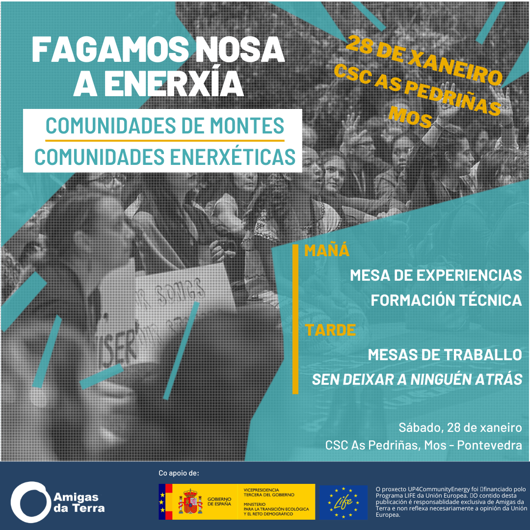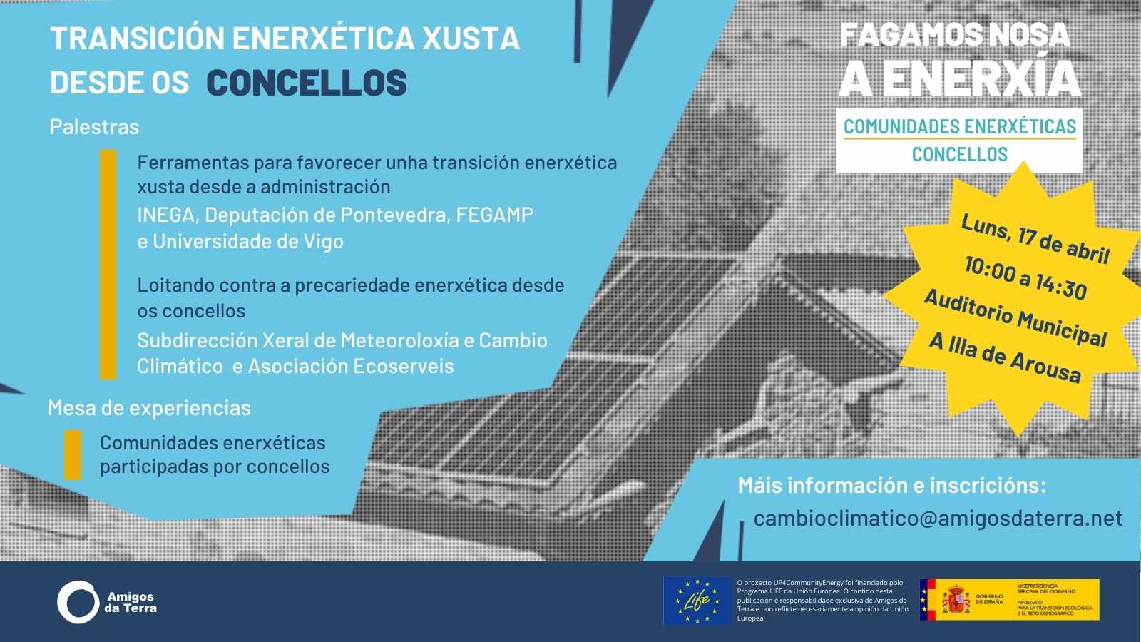 Amigas da Terra convídavos a participar na xornada “Transición Enerxética Xusta desde os Concellos” dentro da campaña Fagamos Nosa a Enerxía que se levará a cabo o luns 17 de abril no Auditorio Municipal da Illa de Arousa.